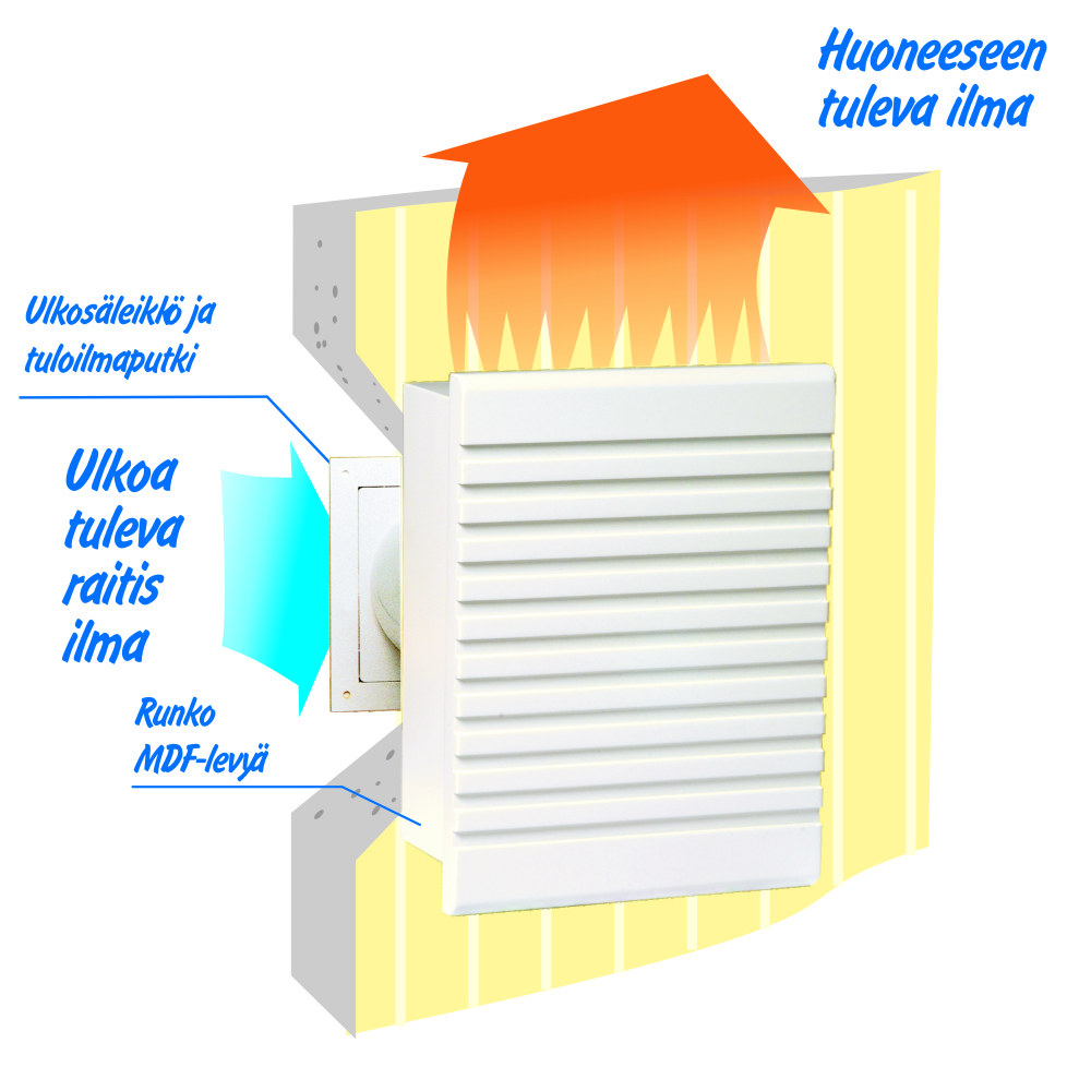 Tuloilmalaitteen toiminta perustuu huoneessa olevaan alipaineeseen, jolloin suodatettua ja raikasta ilmaa virtaa haluttuun tilaan täyttämään alipaine. Haluttaessa ilma voidaan lämmittää kytkemällä lämmitin päälle. Laite on myös energiatehokas, sillä lämmitintä voidaan pitää päällä vain tarpeen vaatiessa. Tällöin huoneen varsinaiset lämmittimet eivät kuormitu niin paljon.